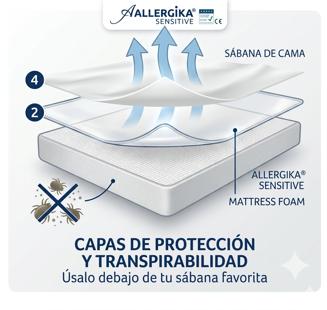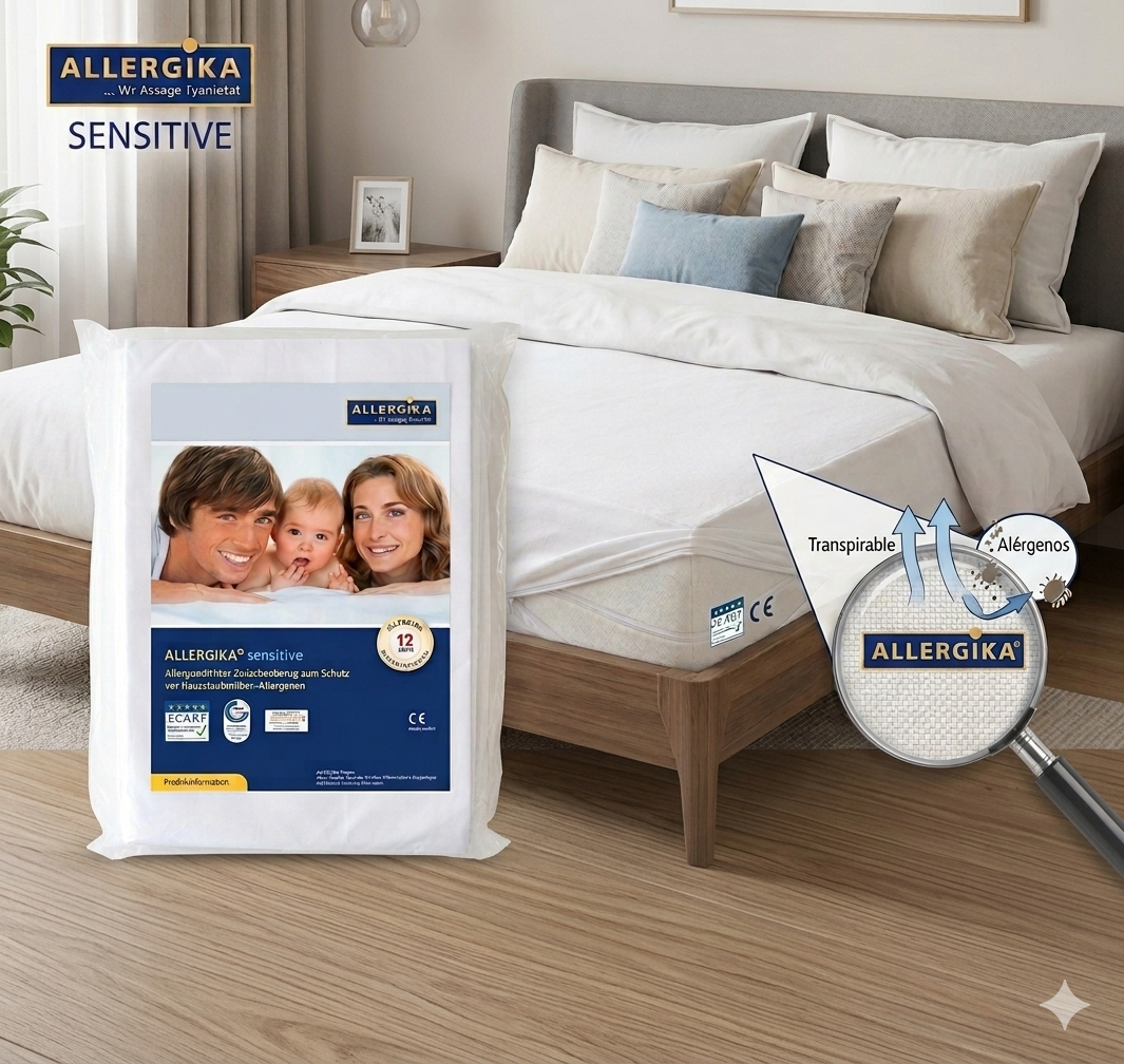 ¿Sabías que el colchón es el lugar donde más se acumulan los ácaros? Recupera la tranquilidad de un descanso profundo con el Protector de Colchón Allergika® Sensitive. Diseñado con tecnología médica alemana, este protector actúa como una barrera física impenetrable (97% de retención de partículas) contra los ácaros y sus alérgenos, sin necesidad de químicos nocivos.