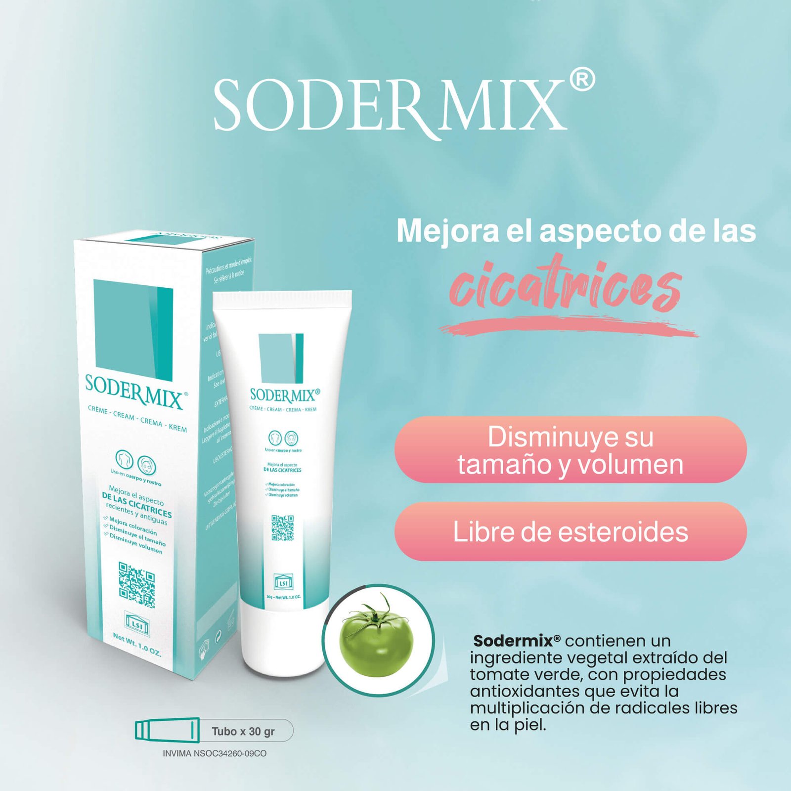 Gracias a su ingrediente activo natural, la Superóxido Dismutasa (SOD) extraída del tomate verde (Solanum Lycopersicum), combate los radicales libres, reduce la inflamación, calma el prurito (picor) y ayuda a emparejar el tono de la piel. Su uso continuo aplaca, suaviza y mejora el aspecto de la cicatriz, promoviendo una regeneración celular saludable.